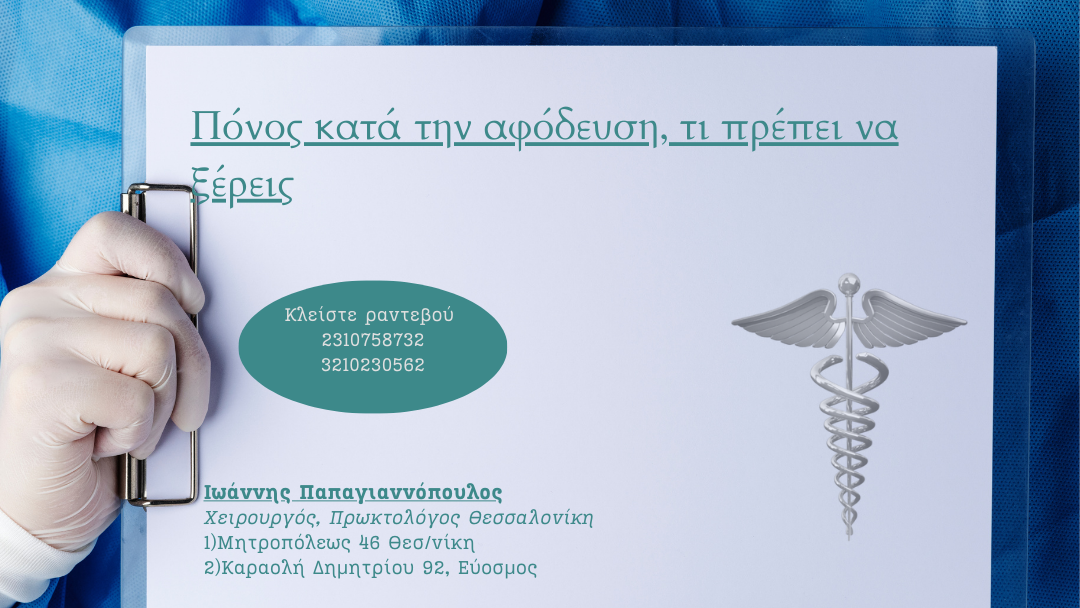 Ο πόνος κατά την αφόδευση είναι ένα σύμπτωμα που αρκετοί ασθενείς αποδίδουν πρόχειρα σε «αιμορροΐδες», χωρίς αυτό να είναι πάντοτε σωστό. Στην πράξη, ο πόνος στην κένωση μπορεί να σχετίζεται με διαφορετικές παθήσεις της περιοχής του πρωκτού, από μία απλή ραγάδα μέχρι φλεγμονή, απόστημα ή άλλη τοπική βλάβη. Η σωστή αξιολόγηση έχει σημασία, διότι η αιτία του πόνου καθορίζει και την κατάλληλη αντιμετώπιση.
